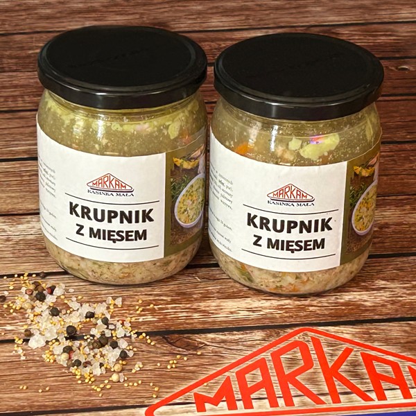 Zupa na wywarze mięsnym z dodatkiem kaszy jęczmiennej, ziemniaków i włoszczyzny. Klasyk kuchni polskiej, gotowa do spożycia po podgrzaniu. Zupa krupnik. Produkt sterylizowany.
